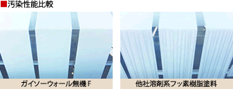 | 親水性に優れたセラミック形成無機華橋剤を配合することにより、従来の塗料では実現できなかった超ハイレベルな耐汚染性を示します。空気中の塵や埃、排気ガスなどによる雨筋汚れが少なく長期間きれいな外壁を維持します。 |