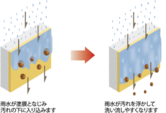 | ガイソーウォール無機Fの主要成分が無機成分なので親水性塗膜を形成します。親水性とは、水滴をはじく撥水性と逆の現象で、表面に水がなじみ、水滴にならずに水膜ができる現象です。撥水性では発生する静電気により汚れを呼び寄せてしまいますが、親水性塗膜は汚れをセルフクリーニング効果により洗い流します。 |