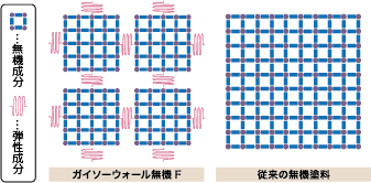 | 無機成分は変化しにくく耐久性が高いですが硬質である難点があります。無機・有機のハイブリッド化により、バランスのとれた強靭で柔軟な塗膜を形成します。無機塗料でありながら住宅塗装に求められる下地の変化に追随する柔軟性があることが特徴です。 |
