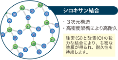 | 最新の技術の無機・有機ハイブリッド技術により屋根塗料において圧倒的に強力な無機塗料が完成しました。無機成分によるシロキサン結合により強靭な塗膜を形成します。また親水性塗膜のため、汚れを洗い流すセルフクリーニング効果があり、汚れが付着しにくいキレイな塗膜を持続できます。 | ![]() |