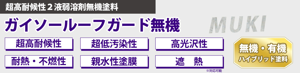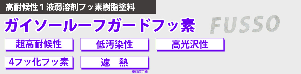 | 従来の屋根塗装で最も強いフッ素塗料に4フッ化技術を取り入れ高耐久な屋根用フッ素塗料が誕生しました。屋根は紫外線や風雨にさらされ劣化が早いですがガイソールーフガードフッ素ならば長期間に渡りスレート屋根や金属屋根の防水性を守れます。一度の施工で長期間屋根を守れるので、経済的にもお得です。 | ![]() |