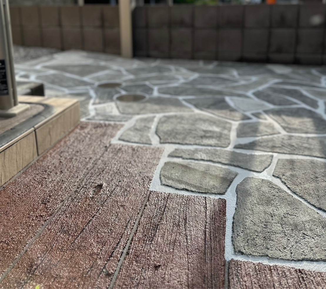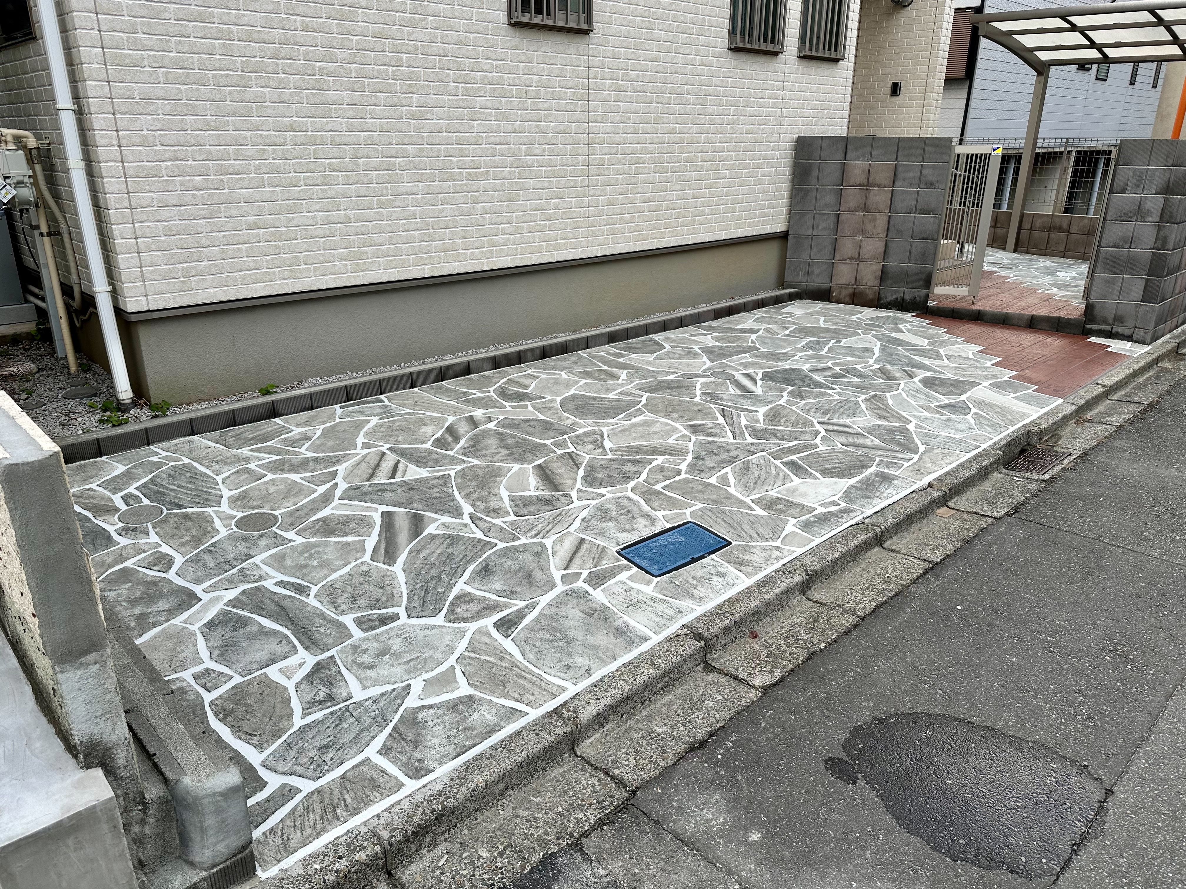 今回のデザインは、駐車場の9割ほどを【乱貼り】という、天然石の乱貼りをイメージしたデザインに、