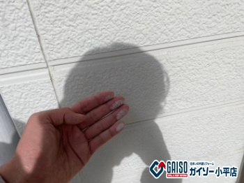 原因:塗料の劣化により、塗膜表面が粉状に剥離している状態。