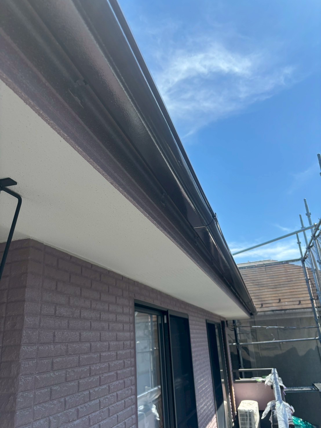 外壁の傷みや崩れた部分はパテ補修をし、下地を整えてから塗装を行っています。 | 付帯部塗装。 軒天などの付帯部分も丁寧に塗装し、建物全体の仕上がりを整えています。 |